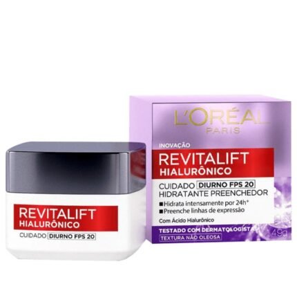 Ideal para iniciar sua rotina de skincare pela manhã, o Creme Revitalift Hialurônico Diurno da L'Oréal é um hidratante preenchedor facial com ação antirrugas. Além de combater os primeiros sinais do envelhecimento, ele hidrata intensamente por 24 horas, além de oferecer proteção FPS 20 e revitalizar a pele.