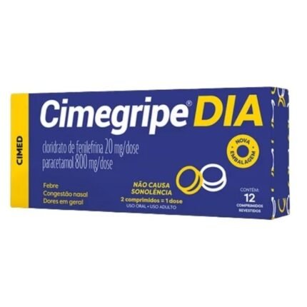 Cimegripe Dia é um medicamento indicado para o tratamento dos sintomas das gripes e resfriados, como dor, febre e congestão nasal. Não provoca sono. Antigripal múltiplo com ação nas gripes, resfriados e congestão nasal. Coriza, febre, cefaléia, dores musculares e demais sintomas presentes nos estados gripais.Cimegripe Dia Com 12 Comprimidos Revestidos Cimed é um medicamento. Seu uso pode trazer riscos. Procure o médico e o farmacêutico. Leia a Bula.Não use junto com outros medicamentos que contenham paracetamol, com álcool, ou em caso de doença grave do fígado.Não use este medicamento em caso de doenças do coração, pressão alta e glaucoma.