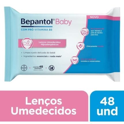 Sempre pensando no bem-estar da mãe, do pai e, claro, dos bebês, a Bayer oferece Bepantol® Baby Lenços Umedecidos que vai além dos lenços comuns. Em sua fórmula única, contém Pró-Vitamina B5 que hidrata a pele de dentro para fora e é livre de fragrâncias, corantes e conservantes, proporcionando uma limpeza pura e delicada para a pele do bebê, com ingredientes essenciais e nada mais. Além disso, Bepantol® Baby Lenços Umedecidos é clinicamente testado e Hipoalergênico. Lenços Umedecidos com Pró-Vitamina B5, que hidrata a pele de dentro para fora, ideal para a limpeza da pele delicada do bebê.
