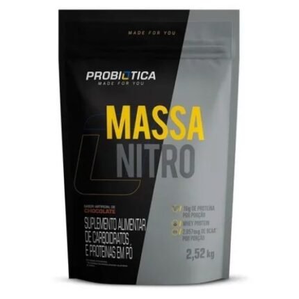 Massa Nitro (Refil-2520g) Probiótica é um suplemento especialmente desenvolvido com uma combinação de proteínas concentrada e isolada do soro do leite, clara de ovo (albumina) e proteína isolada de soja, resultando em um perfil de aminoácidos de elevada digestibilidade. Massa NitrO® também conta com diversos carboidratos na composição contribuindo para manutenção dos níveis energia constantes, que garantem, na porção diária de 360g (3 shakes), 100% da ingestão diária recomendada. A sugestão de consumo de 3 shakes (360g) de Massa Nitro® com leite desnatado proporcionará em média 25g de proteína e mais de 500 kcal, por Shake.* Antes do consumo, sugerimos que leia atentamente a embalagem. Todas as informações sobre produtos possuem apenas propósitos educativos e não tem a intenção de substituir diagnósticos, prescrições ou orientações profissionais.
